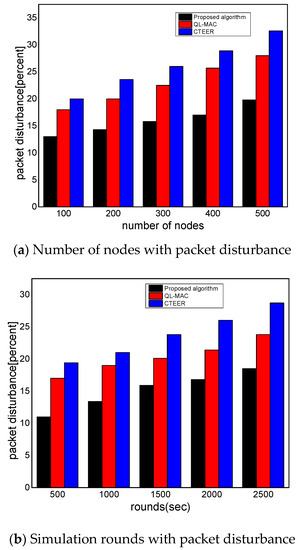 Figure 7a,b illustrates the performance evaluation of the proposed algorithm for packet disturbance with existing solutions. It can be determined as a ratio of the number of packets lost to the data packets transmitted in a communication system. Compared to other work, the proposed algorithm improves the packet disturbance ratio by an average of 34% and 28% under a varying number of nodes and rounds. This is because the proposed algorithm does not overlook the constraint resource of the nodes and uniformly distributes the communication load among devices using reinforcement learning. Unlike QL-MAC and CTEER, the proposed algorithm utilizes network conditions in terms of multiple criteria and balances the data distribution on transmission links with the evaluation of the link cost. The proposed algorithm utilizes the PRR and response time factors in determining the optimal neighbors from the set of nodes. Additionally, with better utilization of the energy consumption of data forwarders, the proposed algorithm increases the strength of routes and prolongs the stability of the transmission system. Moreover, the D2D multi-criteria reinforcement learning-based routing decision avoids the chance of selecting faulty and overloaded links for the forwarding of IoT data. Based on the reward value, the proposed algorithm increases the efficiency for learning and offers a stable routing performance. Unlike QL-MAC and CTEER, the authentication and verification process of the proposed algorithm offers trustworthy communication among devices and supports improved packets’ distribution over the links.