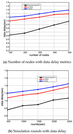 Figure 8a,b illustrates the experimental results of the proposed algorithm compared to the existing solution. It measures the round-trip time of forwarding the network data towards its destination in the communication system. It was observed that the proposed algorithm significantly decreased the data delay by an average of 20% and 23% for varying nodes and rounds. The proposed algorithm utilizes the concept of mobile sensors that rapidly shift their positions for the observation and forwarding of network data. In addition, the multi-criteria parameters in the forwarding scheme explicitly achieve optimal performance for constraint devices. Unlike most of the other proposed reinforcement learning schemes, the proposed algorithm assigns the appropriate rewards to nodes, decreasing the response time and data delay for smart mobile devices. Moreover, it uses the error rate metrics in determining the loss ratio, and thus only optimal neighbors whose link cost is not congested are chosen for data routing. The D2D direct authentication and verification in the routing of data packets also decrease the involvement of unauthorized nodes. Such an approach improves the transmission path, avoiding unnecessary delays and retransmissions. Unlike other solutions that impose overheads for securing the data forwarding and lead to a high delay rate, our proposed algorithm offers lightweight session keys based on secure routing, which explicitly minimizes the latency ratio on communication paths.