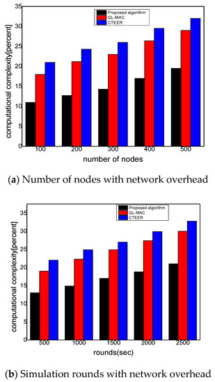 Figure 10a,b demonstrate the experimental results of the proposed algorithm compared to the existing solution for computational complexity. The results determined the number of processing overheads it takes to execute the proposed algorithm. It was seen that the proposed algorithm minimized the computational complexity by 36% and 39% for varying numbers of nodes and rounds. In computing the computational time, the proposed algorithm measures the number of route requests and route response packets, especially in the presence of malicious nodes. Moreover, it also considers the number of retransmissions in computing the computational time of the proposed algorithm. Based on the security function, the proposed algorithm efficiently identified the false requester, which significantly decreases the ratio for a computational time as compared to other solutions. Furthermore, using the reinforcement learning technique, balanced the resources’ consumption among the nodes and decreased the communication complexity by minimizing the least distance towards the sink node. The gateways perform the role of local supervision and reduced the cost of D2D communication by utilizing the method of coverage limit. Unlike QL-MAC and CTEER, the proposed algorithm supports the authentication and verification phase for mobile sensors and avoids the chance of malicious nodes generating excessive false traffic. Additionally, such security methods of the proposed algorithm impose the least communication complexity on constraint devices in the presence of malicious nodes, with affordable data retransmissions. Moreover, the link cost function identifies the more appropriate trusted links by utilizing the information of packets’ reception and data error.