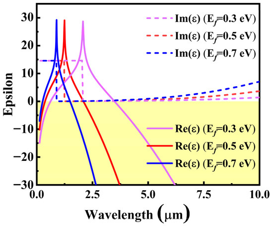 Therefore, when considering the Drude damping ( instead of ), the dielectric function of the DSM is shown in Figure 2.