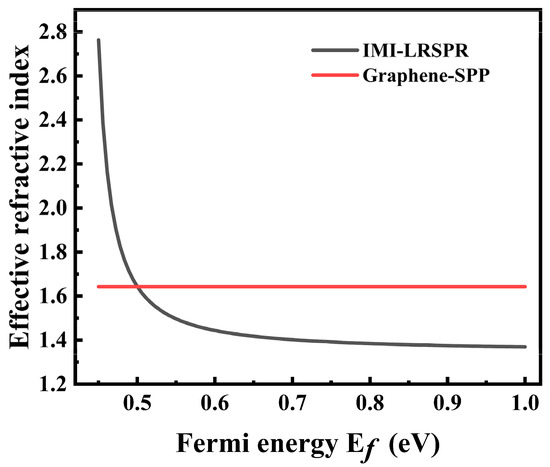 Previous studies have reported that LRSPR can significantly reduce the half-peak width of the resonance, resulting in sharp phase changes and a significant increase in GH shifts [30]. To further increase the GH shifts, the structural coupling between graphene SPP and DSM LRSPR was used to obtain better performance. To verify that graphene SPPs can couple with LRSPR with an IMI structure, the coupling conditions were studied. When the incident light = 119 THz, the effective refractive index varies with the of the DSM, as shown in Figure 4.