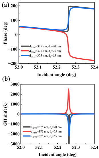 In this coupled structure, the GH shifts are affected by many factors. For example, the thickness of the metal layer in the IMI structure that excites the LRSPR, the thickness of the coupling layer, etc. As shown in Figure 5, when the coupling layer thickness and DSM thickness are selected as the optimal thickness (e.g., dDSM = 375 nm, dc = 70 nm), the phase change abruptly changes, resulting in a maximum GH shift.