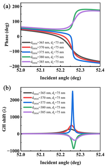 Similarly, because the thickness of the DSM affects the LRSPR, the GH shifts can also be regulated by adjusting the thickness of the DSM, as shown in Figure 7. When the thickness of the coupling layer is at a non-optimal thickness, the thickness of the DSM can also significantly change the magnitude and direction of the GH and slightly change the angle of the GH shifts to a maximum. When the thickness of the DSM is less than 375 nm, the GH shift is positive and its reflection phase decreases with the increase in angle; when the thickness of the DSM is more than 375 nm, the GH shift is negative and the phase increases with the increase in angle. As the thickness of the DSM increases, the effective permittivity of its structure also increases, which causes the maximum value of the GH to shift slightly to a high angle. When the DSM thickness is far from the optimal value, its GH peak decreases significantly, and the half-peak width increases gradually owing to the gradual loss of resonance conditions.