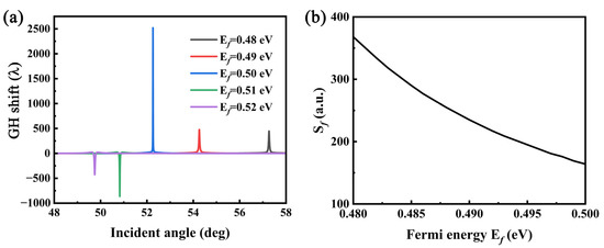 As the optical properties of Dirac semimetals are closely related to the Fermi energy, we can easily change the Fermi energy of Dirac semimetals by chemical doping, external gate electric field, etc. [48,49,50], to adjust the GH shift of the coupling structure. Similarly, this structure can not only adjust the positive and negative GH through the change in the DSM Fermi energy, but also adjust its resonance angle. This is mainly attributed to the fact that the Fermi energy significantly changes the permittivity of the DSM, which changes the effective refractive index of the structure. Additionally, the effective refractive index of the structure significantly affects the resonance angle [51]. As shown in Figure 8a, when the Fermi energy is less than 0.5 eV, the GH shift is negative, and when it is more than 0.5 eV, the GH shift is positive. We can define the Fermi energy sensitivity factor as =, and it is easy to detect subtle changes in the Fermi level, using the change in the resonance angle. When the Fermi level is changed from 0.48 eV to 0.52 eV, there is a clear change in the peak position, which has a sensitivity of more than 100 deg/eV in the range. It is easy to understand that as the Fermi level increases, the effective refractive index decreases, and its resonance angle decreases accordingly. It can be seen from Figure 4 that when the Fermi level is <0.5 eV, the effective refractive index of the IMI structure changes sharply, which can lead to a large change in the effective refractive index of the entire structure; therefore, it has a high sensitivity of more than 150°/eV in the range (in Figure 8b).