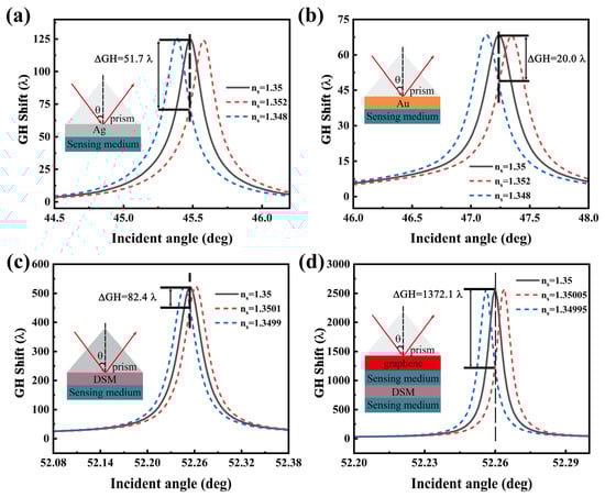Finally, we found that a slight change in the sensing medium results in a significant change in the GH displacement; therefore, the refractive index sensor can be designed accordingly. As shown in Figure 9, we compared it with the traditional metal SPR sensor and the SPR sensor of the DSM. In the traditional Au (Ag) sensor, we used an excitation wavelength of 632.8 nm, Au (Ag) film thickness of 45 nm, and nAu = 0.7900 + 17.3109i, nAg = 0.1675 + 3.4728i. The parameters are consistent with previous studies [21,52,53]. When the refractive index of the sensing medium changes 0.002, the GH shifts changed by 51.7 .According to Equation (12), the sensitivity can be obtained as Sn . Additionally, based on the DSM structure, it has a larger while changing the smaller refractive index of the sensing medium (). Therefore, it has a higher sensitivity, Sn relative to the traditional metal sensor. The proposed coupling structure has large GH shifts compared to traditional metals. While the change in the sensing dielectric constant is very small, its GH shift changes sharply, with the purpose to obtain Sn ≈ 2.7. Compared with traditional metal sensor, it has been improved by three orders of magnitude.