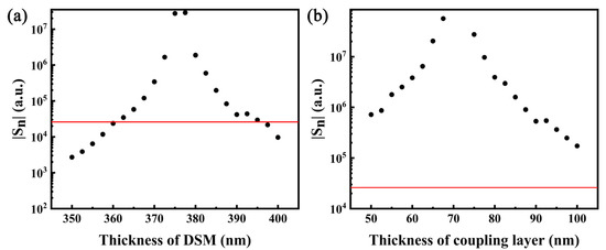 Figure 10 shows the variation in sensitivity Sn with the DSM thickness and coupling layer thickness. Its GH shift is the greatest near the optimum thickness, which also results in the greatest sensitivity. As one moves away from the optimum thickness, the sensitivity decreases; however, it is still is greater than that of the conventional metallic SPR structure within a certain range, which provides a process tolerance for the actual device.