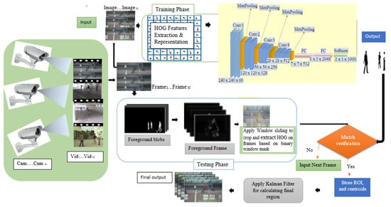 The algorithm’s process of determining an object’s background is split into several separated steps to eliminate backgrounds that might otherwise be classified [25,26,27]. This is embraced by subtracting the objects’ background and computing a foreground mask on colored video frames [28] and gray images captured from multiple surveillance cameras. The proposed algorithm takes an input of the 120 × 32 images, cleans and converts them into binary format, and then smoothens the pixels on binary images by applying morphological operations that are followed by the implementation of a Laplacian of Gaussian model (LOG) mixture after blobs. The images undergo further feature extraction and computation with the HOG descriptor. We stored these features into a 2-dimensional array and passed them to the fully connected multi-layer neural network for further classifications and matching computation, as shown in Figure 1. The CNN flattens the given 2D array into a single feature vector that is used to determine the object of interest’s class. Then an output from the HOG descriptor compared them with the object of interest on the input frame based on the connected components, image region properties, and window binary mask. The sliding window tactics were applied on input frames to reduce the data size, processing time, and to improve the object locating during tracking in one step. The normalized cross-function is used to obtain the object centroids on these images. Finally, we considered the use of the Kalman filter to track the object of interest, based on the computed centroids.