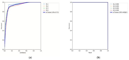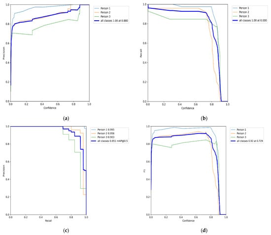 The label (a) shows the precision(P) versus confidence(C) graph, (b) the recall(R) versus confidence(C), (c) is the mean average precision(mAP) based on comparing the truth bounding box and detection box, and (d) the IDF1 score at 100% with confidence of 0.626, which advocates the balance between P and R based on passageway scenes dataset. The mAP for all classes is high and accurately modeling detections at 95.1% with a threshold of 0.5. The P and R are high at 100% and 100%, respectively, and more confidence at 0.713 and 0.0 respectively for all classes.