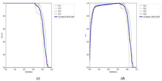 The label (a) shows the precision (P) versus confidence (C) graph, (b) the recall (R) versus confidence (C), (c) is the mean average precision based on comparing the truth bounding box and detection box, and (d) the IDF1 score at 92% with confidence of 0.729, advocates the balancing between the P and R based on Campus scenes images dataset. The mAP for all classes is high and accurately modeling detections at 95.1% with a threshold of 0.5. The P and R are high at 88.0%, and 87.5%, respectively, and more confidence at 0.8 and 0.78, respectively, for all classes.