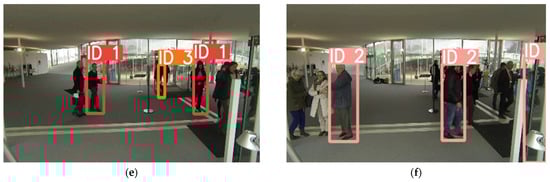 Thus, for real-time tracking, we evaluated our algorithm with several video frames taken from two different sequences of the EPFL dataset, as shown in Table 2 and Table 3. The CLEAR MOT is used for evaluations, where denotes high performance and represents lower performance. In both sequences, our approach recorded an average overall performance above 80% with very few fragmentations and ID switches in all metrics. Further training and testing were conducted on our algorithm without Kalman filter using the 8000 frames from the real-time overlapping multiple cameras dataset (EPFL-RCL multi-cameras). In the comparison exercise, we found that the model’s MOTA, MOTP, precision, and recall performance were very low compared to the one with the Kalman filter in Table 2, Table 3 and Table 4. It had a low detection ratio and a high ID switches ratio that adversely affected the overall tracking results. This is displayed in Table 5 and illustrated well in Figure 9e,f, where the Kalman Filter and segmentation technique are removed from our proposed HCNN algorithm. However, the proposed HCNN with Kalman filter performed very closely to the Yolo5Deep model in Table 4. This proves that the proposed model provides a better data affinity of a close equivalent to the Yolo5Deep model in real-time multiple object tracking.
