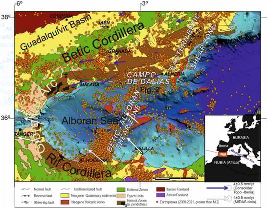 Regional geological setting and seismicity of the Gibraltar Arc: Major geological units are included onshore. Offshore, the main tectonic structures are indicated with detailed bathymetry. Earthquake data from IGN (www.ign.es, accessed on 1 February 2022); GNSS displacement in the central and eastern Betic Cordillera from the Consolider Topo-Iberia network [13,14,15], and in the Rif Cordillera, Gibraltar Strait, and central Alboran Sea from MIDAS velocity fields, Nevada Geodetic Laboratory (http://geodesy.unr.edu/velocities/midas.IGS14.txt, accessed on 20 February 2022). The location of the Campo de Dalias study area (Figure 2) is indicated.