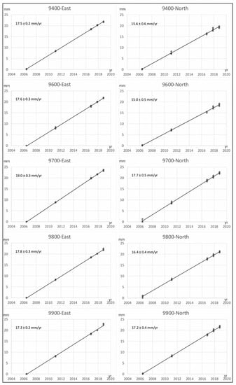Data processing was done with GIPSY-OASIS software using JPL’s orbit and clock products for the GPS constellation [46]. Antenna calibration file, GMF troposphere mapping function, ionosphere TEC values, FES2004 ocean tide loading model [47], and WahrK1 terrestrial tide model were taken into account. Positions were computed according to 300 s sampling of the RINEX observations for the coordinate estimation in the IGS14 reference frame. The linear trend on the position time series (Figure 3) was computed using CATS time series analysis software [48]. The model applied to the original time series consists of an intercept, a site rate, and an offset to account for the change of antenna and receiver between the 2011 and 2016 campaigns. Finally, the residual velocity field was calculated with respect to stable Eurasia by subtracting the rigid motion of Eurasia from the ITRF2014 plate motion model [49] (Figure 2a). The plate velocity vi of a site at position Ri on a plate with rotation described by the angular velocity vector of the plate Ω is given by the vector cross-product vi = Ω × Ri. To highlight the activity of local structures, we also determined relative velocities with respect to Sites 9400 (Figure 2b) and 9900 (Figure 2c).