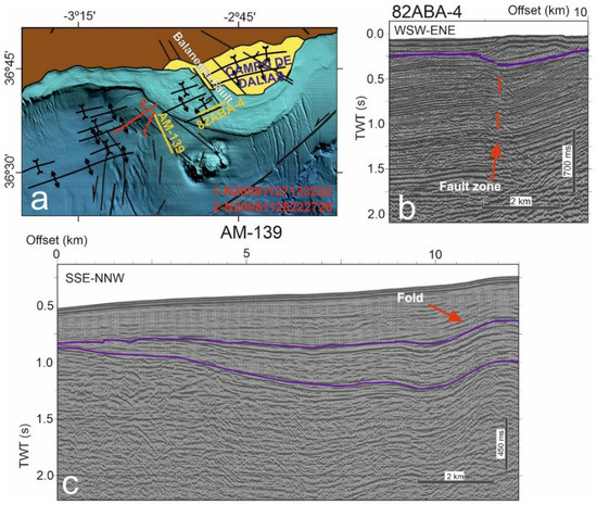 Seismic reflection profiles offshore of the Campo de Dalias: (a) Location of the profiles on the regional sketch of the main tectonic structures. (b) Profile 82 ABA-4, at the southern tip of the Balanegra Fault. (c) Profile AM-139, orthogonal to the east-northeast–west-southwest folds.
