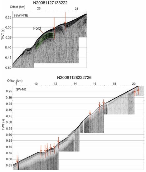 Seismic reflection data offshore of the western Campo de Dalias (Figure 4 and Figure 5) were analyzed to determine the main features of the active faults and folds. Multichannel and high-resolution seismic reflection profiles from the database of the Instituto de Ciencias del Mar (ICM-CSIC, http://gma.icm.csic.es/sites/default/files/geowebs/OLsurveys/index.htm, accessed on 1 February 2022) were obtained following standard procedures of acquisition and processing. The southeastward offshore continuity of the Balanegra Fault zone (Figure 4a) is intersected orthogonally by profile 82 ABA-4 (Figure 4b), imaging a roughly vertical deformation zone, with a downthrown eastern block covered by unfaulted sediments with an eastward upraised bathymetric elevation. This geometry may be compatible with an early strike-slip motion that became inactive in this section. Profile AM-139 (Figure 4c), orthogonal to the east-northeast–west-southwest fold system, shows that folds are open and irregular, reaching kilometric sizes, yet deformation increases in depth, supporting the progressive activity. High-resolution profiles to the west of the Balanegra Fault (Figure 5) show that both folds and faults also affect the most recent sediments, even displacing the topography, and should therefore be considered to be active structures.