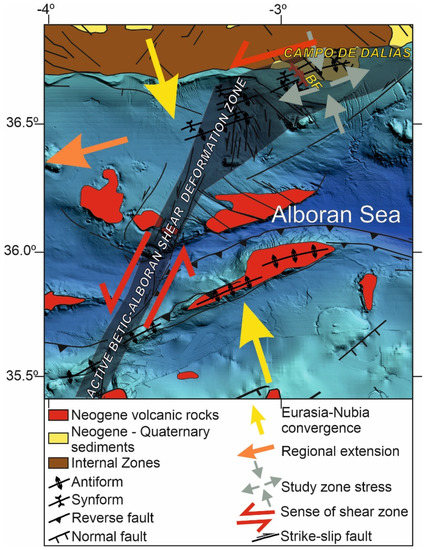 At a regional scale, the study area accommodated deformation of the north-northeast tip of the sinistral Betic–Alboran shear zone, crossing the Alboran Sea. The pattern of active deformation, with westward displacement decreasing toward the south, is consistent with the coexistence in this region of roll-back tectonics—a driving process well developed in the western Gibraltar Arc—and indentation tectonics, dominant farther east and south. These results point to the coexistence of different tectonic mechanisms during the development in the westernmost Mediterranean, leading to the development of the Gibraltar Arc.