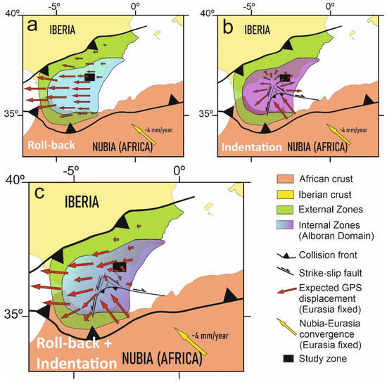 Expected displacement patterns during the development of the Gibraltar Arc with respect to stable Eurasia by (a) roll-back tectonics, with a regional westward displacement increasing toward the central and western parts of the tectonic arc; (b) indentation tectonics, with a radial pattern; and (c) the interaction of roll-back and indentation tectonics—in agreement with the Campo de Dalias GNSS network’s present results, the residual velocity field decreases and rotates clockwise from the north towards the south of the study area.