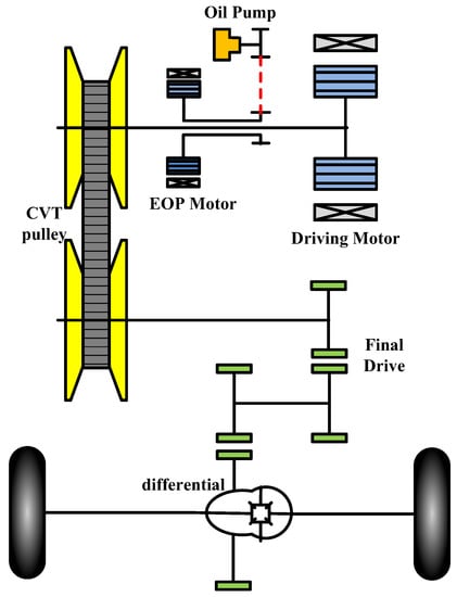 The configuration of the pure electric CVT proposed in this paper is shown in Figure 1. The structure is similar to that of the traditional CVT structure, but the hydraulic torque converter and clutch are eliminated according to functional requirements. The hydraulic system employs the electric oil pump (EOP) as the power source, which can realize the independent drive of the oil pump.