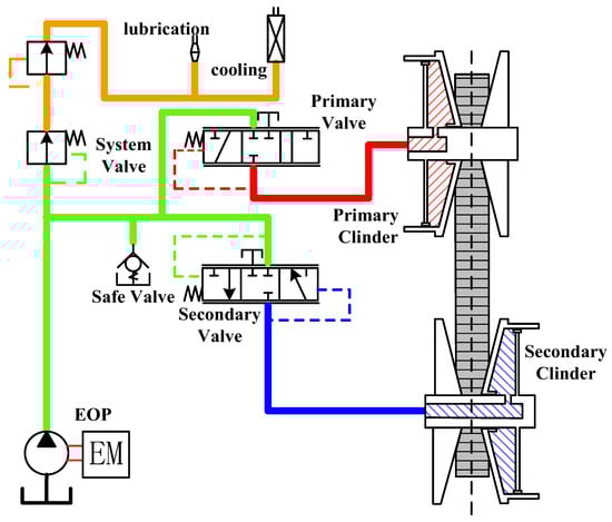 Figure 2 displays the hydraulic system construction for the pure electric CVT. The oil pump is driven by a separate motor rather than coupled with the speed of the drive motor. The oil circuit can be divided into three parts according to the oil pressure. The first part provides pressure on the secondary side, which is used to control the clamping force of the CVT and ensure the torque transmission. The second part supplies pressure for CVT speed ratio adjustment. The third part is used to cool and lubricate the components of the transmission system.