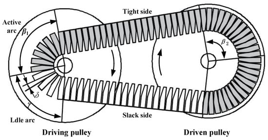 There is a squeezing force between the metal sheets at the tight side, while the slack side has no squeezing force. Due to the gap inconsistency between the tight side and slack side, the pulley will slip during transmission [25]. The slip rate s can be expressed as: