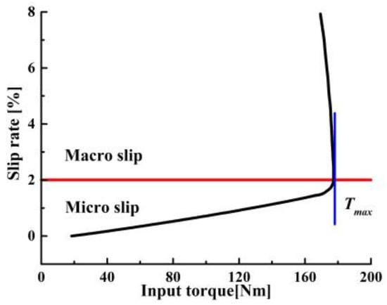 When the clamping force is constant, DROGEN et al. divided the CVT slip into the macro slip and micro slip under the condition of certain clamping force [38], as shown in Figure 4. Macro slip is commonly referred to as metal belt slip. It could cause rapid wear of the steel belt and affect the transmission, which should be avoided as much as possible.