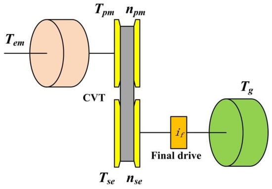 where Ip and Is are the input and output moments of inertia of the CVT, Tem is the motor torque, Tq is the torque of the wheel drive shaft, Tse are the torque secondary pulley, if is the speed ratio of final drive, icvt is the speed ratio of CVT, and ηb is the efficiency of the metal belt.