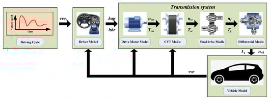 The simulation system is presented in Figure 6, including the driver model, vehicle model, motor model, and the CVT slip dynamic model. The simulation system takes the target vehicle speed vves as the input and the driver model outputs the accelerator opening hap and brake pedal opening hbr. The transmission system transfers the wheel speed nwh and torque Tq to the vehicle model to perform the simulation.