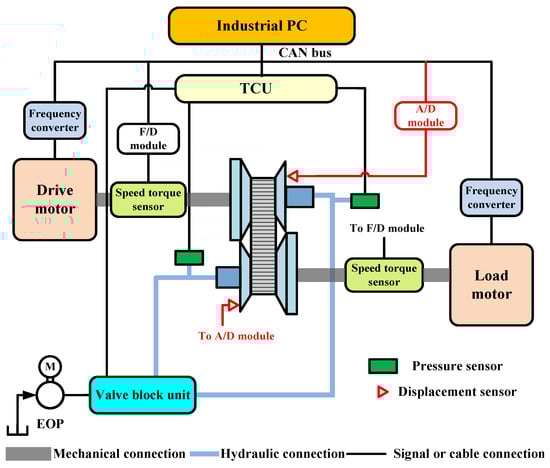 Within a certain slip rate, the friction coefficient and the mechanical efficiency of CVT show the same trend-first increase to the peak and then decrease [27,28]. Thus, the efficiency can be improved by reasonably controlling CVT slip. To design a clamping force control strategy, it is necessary to obtain accurate CVT slip characteristics and their relationship with efficiency. Therefore, a slip characteristic test bench was built. Figure 7 is the schematic diagram of the test bench, and the actual slip test bench is shown in Figure 8. The test device is mainly composed of drive motor, load motor, CVT, TCU, various sensors, and data acquisition system. The drive motor shaft is directly connected to the primary pulley, and the load motor simulates the road load. Considering the influence of oil temperature on the efficiency of CVT, the oil temperature was stabilized at 90 ± 5 °C during the experiment.