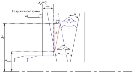 The experimental transmission is a Chinese company self-developed CVT. CVT-related parameters are given in Table 1. The slip rate is defined by the geometric speed ratio and the actual speed ratio, as shown in Equation (2). During the experiment, the actual speed ratio is calculated by data from the primary and secondary speed sensors. The geometric speed ratio is the ratio of the radius of the primary and secondary pulley, which cannot be obtained directly. It can be calculated indirectly through the axial displacement of primary and secondary cone plates measured by the displacement sensors. Here, the calculation of the radius of the primary pulley is taken as an example, as shown in Figure 9. The specifications and parameters of various sensors and other components are shown in Table 2. The actual radius of the primary and secondary pulley can be expressed as: