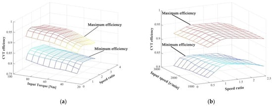 The relationship between CVT extreme efficiency and speed and torque: (a) the relationship between CVT efficiency and input torque and speed ratio (ωpm = 2000 r/min); (b) the relationship between CVT efficiency and input speed and speed ratio (Tpm = 60 Nm).