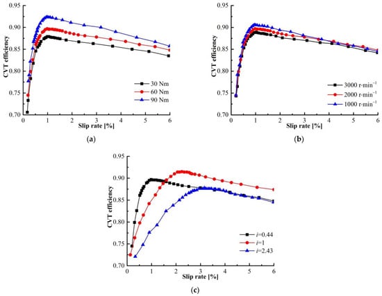 CVT slip-efficiency characteristics: (a) slip-efficiency characteristics under different input torque; (b) slip-efficiency characteristics under different input speed; (c) slip-efficiency characteristics under different speed ratio.