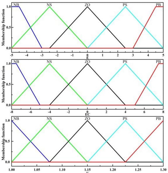 The fuzzy control system is a system with two inputs and one output. The inputs of the controller are the error of slip rate and changing rate of error. Their domains are [−5, −4, −3, −2, −1, 0, 1, 2, 3, 4, 5] and [−8, −6, −4, −2, 0, 2, 4, 6, 8]. The domain of the system output is [1, 1.05, 1.10, 1.20, 1.25, 1.30]. The membership function in the middle part of the input adopts the trigonometric function, and the trapezoidal function is adopted at the two edges. The output membership functions are all trigonometric functions. The fuzzy language variables are the following: NB, NS, ZO, PS, PB. Figure 14 shows the input and output membership functions of the fuzzy system. Table 4 shows the fuzzy control rules.