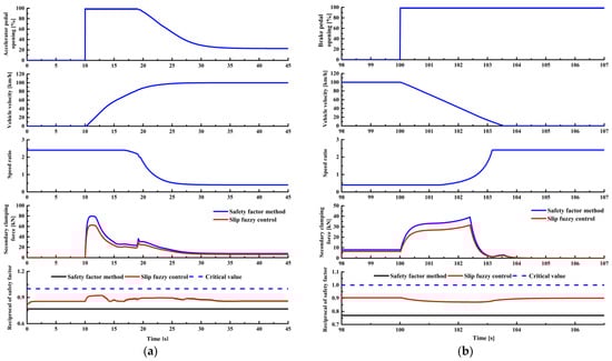 Figure 15a,b show the simulation results of acceleration and emergency braking conditions. It can be seen that the 1/Sfr of the proposed control strategy in the two working conditions is lower than the critical value. This means that there is no risk of macro slip in the metal belt during transmission. Compared with the traditional safety factor strategy, the clamping force slip fuzzy control strategy can reduce the CVT clamping force. In the two conditions, the clamping force can be reduced by a maximum of 19.49% and 21.65%, respectively. This is because the proposed control strategy can adjust the target clamping force according to the current slip state of the CVT, which leads to a reduction in clamping force. Due to the limited power of the motor, the output torque of the motor drops at about 13 s to ensure the output speed, so the clamping force presents a process of fluctuations.