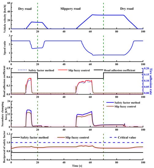 The simulation results of the road adhesion coefficient abrupt change condition are presented in Figure 16. The vehicle enters the slippery road from a dry road at 20 s and then drives to a dry road again at 70 s. When the road adhesion coefficient changes, the drive tire adhesion rate is consistently lower than the road adhesion coefficient, so the drive wheels will not slip. At the same time, 1/Sfr is lower than the critical value, and there is no macro slip in CVT. Additionally, the clamping force fuzzy control strategy reduces the clamping force to a certain extent.