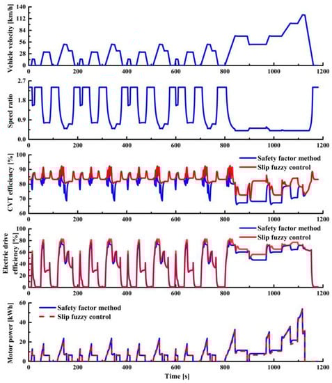 Synthesizing the simulation results of the three working conditions, it is clear that the clamping force fuzzy control strategy based on slip has good adaptability. The proposed strategy can still ensure the metal belt does not slip under extreme conditions; thus, this strategy is feasible for clamping force control. In the next section, simulations will be conducted under standard driving cycles, and explore the impact of the proposed strategy on vehicle energy consumption and transmission efficiency.