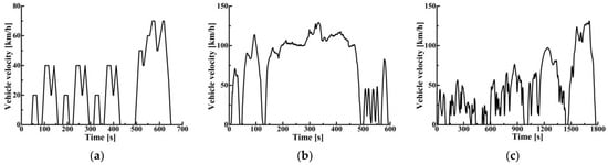 Vehicle velocity profiles of different driving cycles: (a) 1015 driving cycle; (b) US06 driving cycle; (c) WLTC driving cycle.