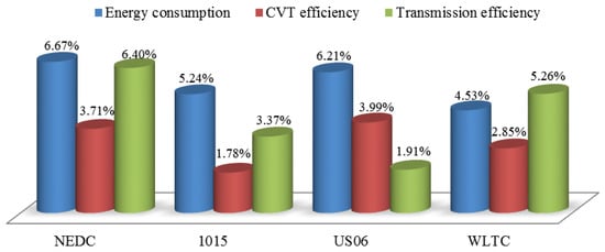 The improvement rate of each index under different driving cycles is shown in Figure 19. The transmission efficiency here refers to the total efficiency of the motor and CVT. It can be seen from the simulation results that the clamping force fuzzy control strategy based on slip rate can bring positive efficiency and energy consumption benefits.