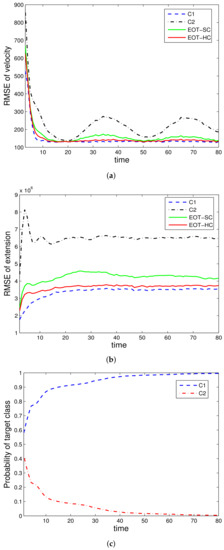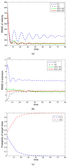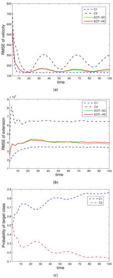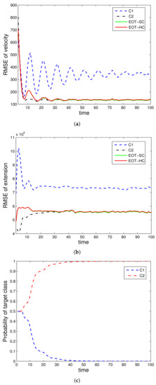 The evaluated performances are velocity estimation RMSE, extension estimation RMSE, and estimated class probability of each target class. For denotation simplicity, “EOT-SC” and “EOT-HC” mean EOT with embedded soft classification and EOT with embedded hard classification, respectively. “C1” and “C2” mean the corresponding performance under class and class , respectively. In each simulation run, the true target class remains constant throughout the whole time steps.