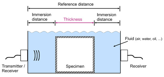 Sketch of a conventional immersed through-transmission setup for ToF measurement. The ToF through the specimen thickness is the target quantity. For an accurate measurement, knowledge of the transmitter characteristics and either the speed of sound in the immersion fluid and the immersion distances or the reference distance are required.