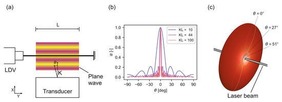 where is a directivity factor, L is the length of the laser beam intersecting the sound field, is the piezo-optic coefficient, and is the refractive index of the immersion fluid. The acoustic field is modeled as a plane wave propagating perpendicular to the laser beam [47] at a sound pressure