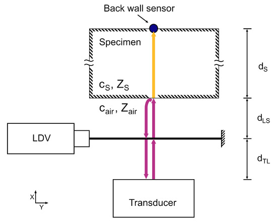 Figure 3 shows a setup that can be used to measure the ToF of an acoustic signal through two media with different specific acoustic impedances Z, one of which needs to be optically transparent to the LDV laser beam. This is the case in air-coupled ultrasonic non-destructive testing when the transducer is immersed in ambient air and sends a signal through a specimen. When the acoustic signal is generated by a transducer, it propagates through the air at the acoustic velocity . It passes the laser beam of the LDV at time