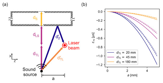 (a) Sketch of an erroneous laser positioning. The arrows indicate the sound paths. The coordinate system is rotated about the x-axis compared to Figure 3a. (b) Calculated ToF due to laser positioning errors for distances that are used in experimental verification. Solid lines: mm, dashed lines: mm, dotted lines: mm.