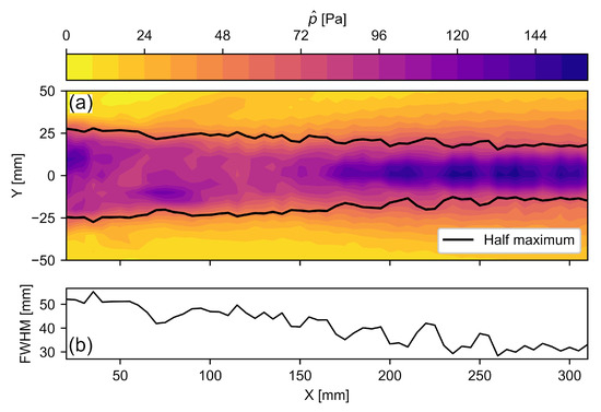 (a) Sound field of the Ultran NCG100-S63 transducer in the center plane, where is the maximum sound pressure. The pressure data originate from a previous study [56]. (b) The full width at half maximum (FWHM) along the x-axis.