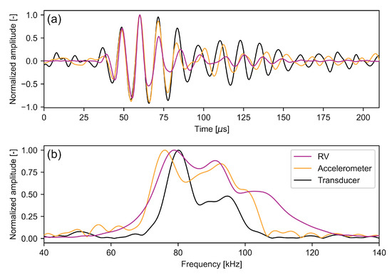 The acquired waveforms are qualitatively similar having a signal length of about 150 s. However, slight differences appear more distinct in the frequency domain (Figure 6b). While the maximum frequency peaks of the RV and the ACU transducers are very close at 79 kHz and 80 kHz, respectively, the maximum frequency measured with the accelerometer is at 76 kHz. Additionally, a second peak is at 91 kHz for the RV data and at 93 kHz for the accelerometer data. These different spectra for the same acoustic pressure burst are caused by the individual frequency responses of the sensors. The piezoelectric transducer itself has a very narrow bandwidth by design, centered at its operating frequency of about 80 kHz. The accelerometer was operated out of its nominal bandwidth, so that the frequency response is not known, but can be assumed not to be flat. The LDV has a sensitivity that is linearly increasing with the frequency, as given in Equation (3). While such differences have little effect in the application of ultrasonic non-destructive testing, they measurably affect the correlation result of Equation (11). The different spectral energy distributions cause a difference in the measured signal period lengths and thus in the envelope shapes, with the latter contributing significantly to the correlation output [29]. This systematic effect is, however, included in the hardware delay of Equation (12) and can thus be corrected.