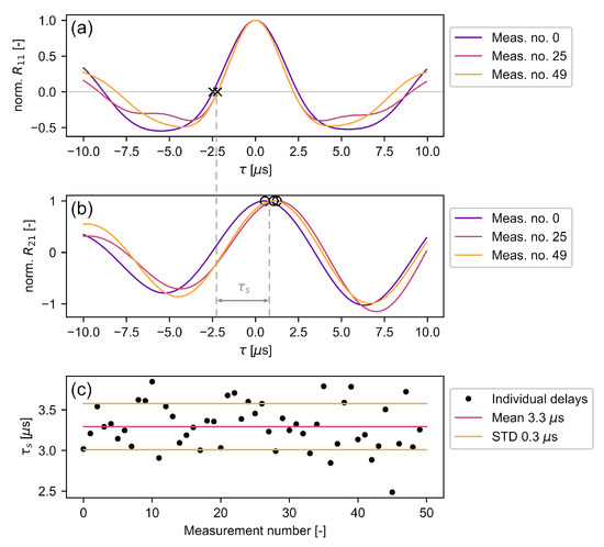 The hardware delay between the sensors was measured by using the LDV in the common vibrometry mode and aiming it at the back surface at a 10 mm distance from the center of the accelerometer. The RV signal should be phase shifted with respect to the accelerometer signal, since the former measures the surface particle velocity and the latter its derivative. If the phase shift deviates from , there is a hardware delay that needs to be corrected. Since the signals are not monochromatic and furthermore have slightly varying frequency content (Section 4.1), it is not sufficient to check only whether the accelerometer signal is phase shifted from the peak RV signal frequency. All included frequency components need to be considered. The Wiener–Khintchine theorem states that the autocorrelation of a signal is the inverse Fourier transform of its power density spectrum [57]. Thus, the first zero-crossing of s of the autocorrelation can be assumed as a good estimate of a mean phase shift of the signal, accounting for its mean square spectral content [58]. The autocorrelation output of three individual signals and their zero-crossings indicating a phase shift are shown in Figure 7a. Without hardware delay, the cross-correlation maxima of (Figure 7b) should be at the location of these zero-crossings. However, the accelerometer signals have a positive delay resulting from varying sensor bandwidth (Section 4.1) as well as internal delays of the sensors, amplifiers, and transmission lines. Figure 7c shows the total hardware delay of all individual measurements as well as its estimate of s and its uncertainty of s. While the use of a non-contact back wall sensor, such as an additional LDV, is expected to cause a decrease in signal-to-noise ratio, it could provide a reduced hardware delay uncertainty since it provides a flat frequency response over a wide range of frequencies [59].