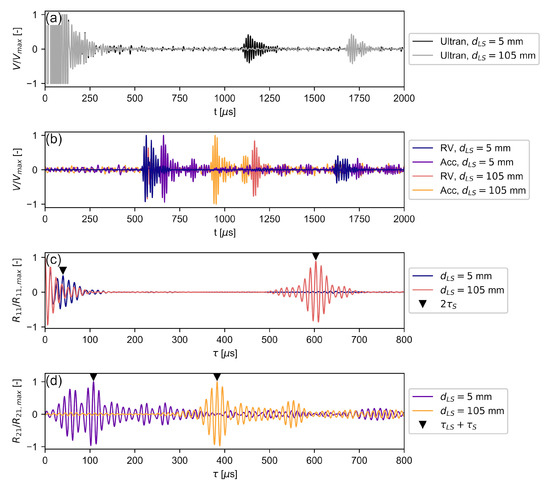 Figure 8d shows the results from cross-correlating the RV signals with the accelerometer signals following Equation (11). The overlap of initial and reflected waves from the RV signal of the mm case is visible in the envelope of the corresponding in the interval s. The first maximum at s represents the cross-correlation of the accelerometer signal with the reflected signal, while the global maximum at s represents the cross-correlation with the initial signal, as given by Equation (12). Using the cross-correlation maximum of the initial signal is preferable because the reflected signal may contain interference caused by the signal overlap, which may cause erroneous correlation results. If the in-air pulses sensed by RV move further apart, as in the mm case, both correlation maxima may be used equally for determining . Since the accelerometer senses the pulse between the initial and received pulse (Figure 8b), the correlation result corresponding to the reflected pulse moves into the negative range, which has been omitted in Figure 8d.