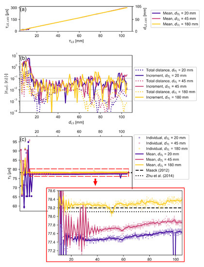 Experimental validation for various and : (a) shows the mean calculated distance between laser and specimen as well as the corresponding time delay; (b) shows the error for this calculated distance for each individual step as well as for the total distance; (c) shows the resulting ToF for each individual pulse and their mean values. Published data [50,60] on longitudinal acoustic velocity in polyamide were used to calculate the reference ToFs. The calculated for are magnified.