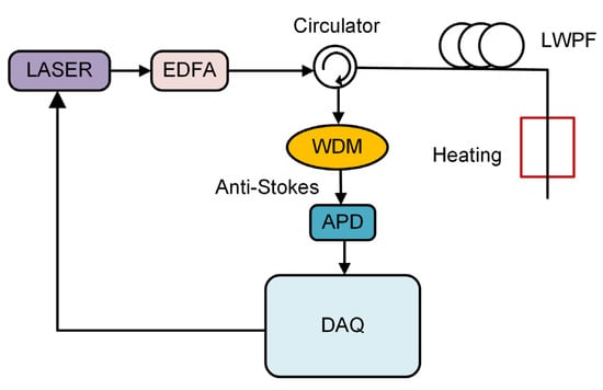 The LWPF-based RDTS setup is shown in Figure 1. An optical pulse with a wavelength of 1550 nm is generated through the laser with a pulse width of 10 ns. After being amplified by an erbium-doped fiber amplifier (EDFA), the optical pulse enters the LWPF through an optical circulator. The backscattered AS light enters port 2 of the circulator and is then output from port 3. A wavelength division multiplexer (WDM) is used to filter out the AS light. The AS light is then converted to an electrical signal through an avalanche photodetector (APD). The electrical signals are collected by a 250 MSa/s data acquisition card (DAQ) and averaged 4000 times in 1 s. A 24 km LWPF is used as a sensing fiber. The LWPF is manufactured by Yangtze Optical Fibre and Cable (YOFC) company and is designed to have low loss at 1450 nm. We fabricated the LWPF by a plasma chemical vapor deposition process. The base material was pure quartz, and the doping material was germanium tetrachloride. In the process, we prevented hydroxyl groups from entering the process equipment to reduce pollution, and surface etching treatment was used to remove surface pollutants and reduce the influence of residual hydroxyl pollutants.