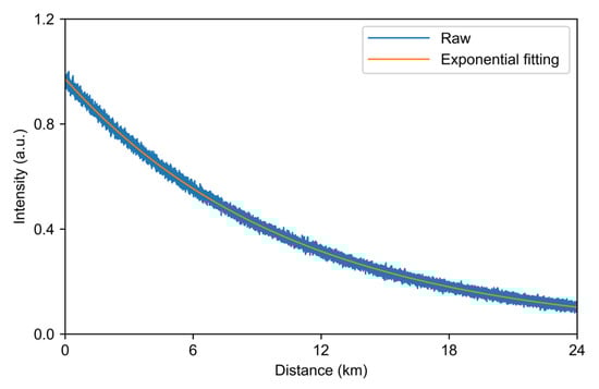 The measured AS light intensity distribution is shown in Figure 2. The blue curve is the raw data of AS light, and the orange one is obtained after fitting the data. After the AS backscattered light passes through the 24 km LWPF, the light intensity drops by 9.78 dB, and the AS loss of the LWPF after conversion is about 0.4 dB/km. The loss of 1550 nm light in the fiber is approximately 0.19 dB/km, so the loss of Raman backscattered light in the fiber is 0.21 dB/km, whereas the loss of Raman backscattered light in a standard SMF is about 0.296 dB/km [11], and that in a standard MMF (OM2) is 0.3 dB/km [12]. Therefore, the LWPF has a relatively low transmission loss, resulting in a higher SNR for long-distance application.