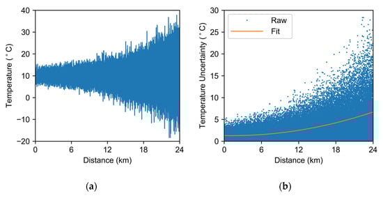 The temperature distribution curve obtained by the demodulation of the raw data is shown in Figure 3a. The temperature profile obtained for LWPF-based RDTS fluctuates at around 10 °C (room temperature). Due to the transmission loss, the measured temperature fluctuates more as the light travels through the fiber. The overall temperature uncertainty in the 24 km LWPF is shown in Figure 3b. The temperature uncertainty degrades as the sensing distance increases, reaching a maximum value of 6.69 °C at the fiber end.