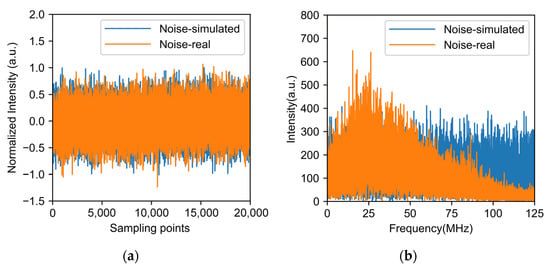 (a) Time domain and (b) frequency domain of simulated noise and real noise.